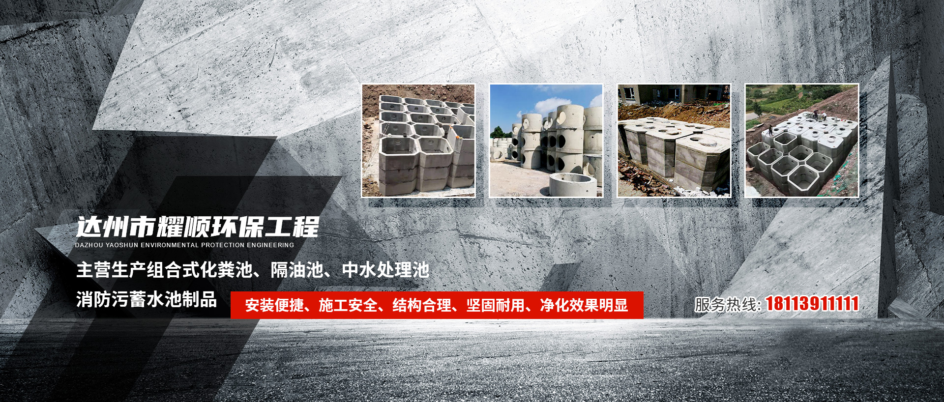 達(dá)州市耀順環(huán)保工程有限公司位于四川東北部、達(dá)州市中部通川區(qū)。本公司采用全自動(dòng)模壓生產(chǎn)線(xiàn),擁有專(zhuān)業(yè)的生產(chǎn)技術(shù)和設(shè)備,同時(shí)擁有一支專(zhuān)業(yè)的施工隊(duì)伍。本公司堅(jiān)持質(zhì)量第一、互惠發(fā)展,讓您的居住環(huán)境更美、更舒適,是我們工人的宗旨。本公司愿與廣大建筑同仁一道,為美化城市作出貢獻(xiàn)。我公司現(xiàn)生產(chǎn)組合式化糞池、隔油池、中水處理池、消防污蓄水池制品。我們的產(chǎn)品在建筑工程中不斷接受檢驗(yàn),具有安裝便捷、施工安全、用時(shí)短、結(jié)構(gòu)合理、堅(jiān)固耐用、抗?jié)B性能好、凈化效果明顯、經(jīng)濟(jì)合理的優(yōu)特點(diǎn)。...